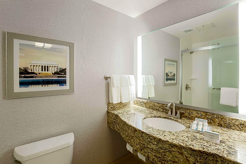 This mobility and hearing accessible standard room features one king-sized bed, and a roll-in shower. The room also has a visual alarm, and notification devices for the doorbell or door knock and incoming telephone calls. Roll-in shower with attached accessible seating, lowered vanity in bathroom, and lowered closet shelf. And the pursuit of the perfect night's stay continues with an evolution of innovative new amenities including the bed, chair and television. The ergonomic Mirra chair by Herman Miller is good for your back and better for work. Enjoy your favorite television show on our 36-inch HDTV. There's also a microwave, refrigerator and coffee/tea maker to help you feel at home. Any corresponding photo may not reflect the specific accessible room type or room feature.